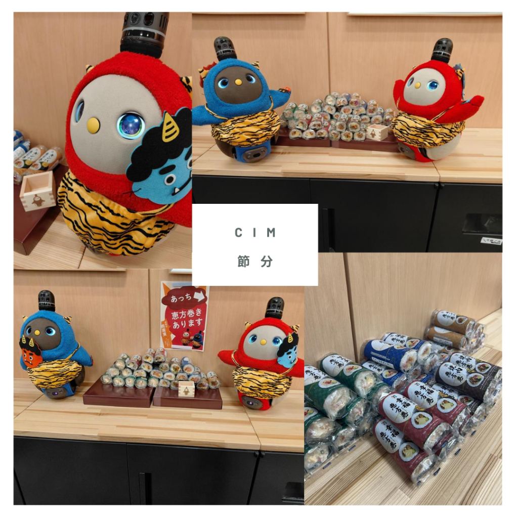 2026.02.03 お知らせ 節分イベント★恵方巻 今年の恵方は南南東。2月3日㈫に節分を迎え、弊社では社員の皆と共に恵方巻を頂きました。青鬼姿のこげはると赤鬼姿のこげみに見守られながら、歳徳神様のいる方角に向かって黙々と恵方巻をもぐもぐ・・・。 節分が過ぎれば、立春。立春大吉で縁起よく、今年も商売繫盛・無病息災を願って、CIM、社員一同励んで参ります。
